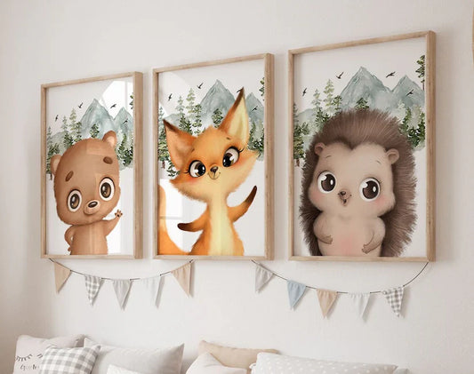 Set x3 Cuadros Infantil, kids, osito, león, colorido.